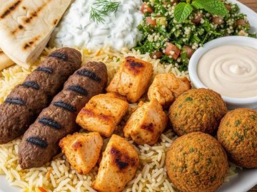 A combination plate of kufta, chicken and falafel served over a bed of rice with tabouli, cucumber yogurt sauce, tahini sauce and fresh pita bread. A great way to try a little of everything!