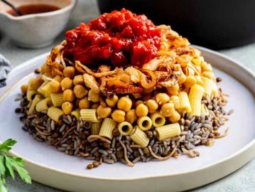 Some call it the national dish of Egypt - a vegetarian street food that combines rice, lentils, and pasta topped with a zesty tomato sauce, chickpease and crispy fried onions.