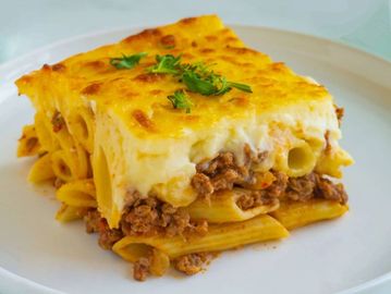 Macaroni mixed with creamy béchamel sauce, then layered with seasoned ground beef and topped with more delicious béchamel sauce. Then baked until golden brown.